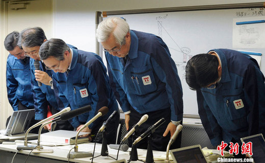 2011年3月28日,東京,東京電力公司召開新聞發(fā)布會(huì),通報(bào)福島核電站最新輻射情況,公司高管就“福島核電站積水輻射超標(biāo)數(shù)值錯(cuò)誤”的問題,向民眾鞠躬道歉。