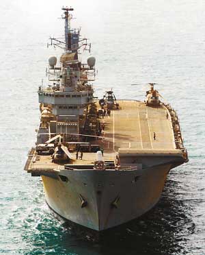 皇家方舟號 1978年12月開工并于1985年11月加入現(xiàn)役 航母全長206.6米,寬27.7米,標(biāo)準(zhǔn)排水量16000噸 配置:載機(jī)為8架“海鷂”式垂直起降戰(zhàn)斗機(jī)和12架“海王”直升機(jī)。 |