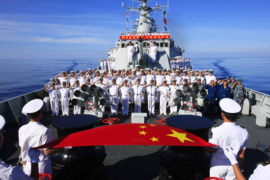 資料圖:中國海軍戰(zhàn)艦上軍人列隊(duì)向國旗敬禮