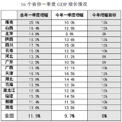 目前,各地一季度經(jīng)濟(jì)運(yùn)行初步核算數(shù)據(jù)陸續(xù)公布。從已公布的16個(gè)省份GDP同比增長(zhǎng)速度看,除湖南和新疆兩地GDP增幅略高于去年同期外,其余14個(gè)省份均低于去年一季度增幅。