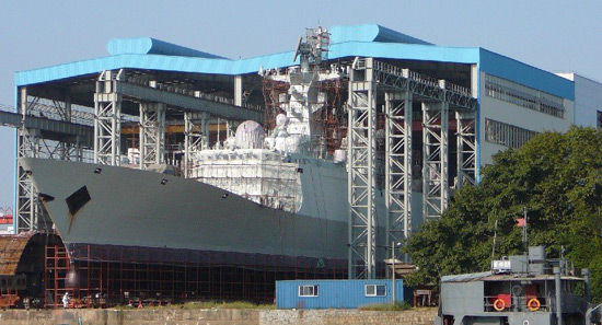 資料圖:我國(guó)造船廠正在建造中的054A新型護(hù)衛(wèi)艦