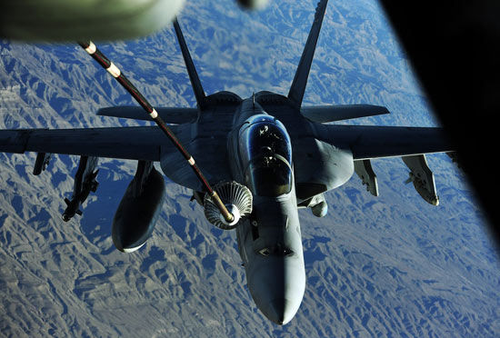 資料圖:美國海軍F/A-18F戰(zhàn)機(jī)在阿富汗上空進(jìn)行空中加油