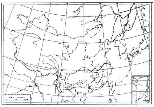 1—吉黑成礦帶;2—內(nèi)蒙—大興安嶺成礦帶3——燕山成礦帶;4—東秦嶺成礦帶;5—祁連—西秦嶺成礦帶6—天山—北山成礦帶7—武當(dāng)—淮陽隆起成礦帶8—下?lián)P子臺褶成礦帶9—東南沿海成礦帶10—江南臺隆成帶11—武夷山加里東隆起成礦帶12—湘贛粵加里東隆起成礦帶13—湘桂粵海西、印支坳陷成礦帶;14-康滇地軸成礦帶15—滇桂臺褶成礦帶16—三江錫鎢成礦帶