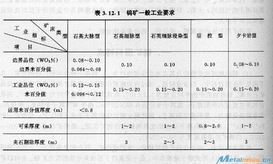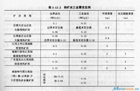 鎢礦產(chǎn)工業(yè)要求(或稱礦產(chǎn)工業(yè)要求),包括礦床邊界品位(WO3%)、工業(yè)品位(WO3%)、可采厚度(m)和夾石剔除厚度(m),對各類型礦床均有不同指標(表3.12.1);典型礦床工業(yè)要求實例見表3.12.2。