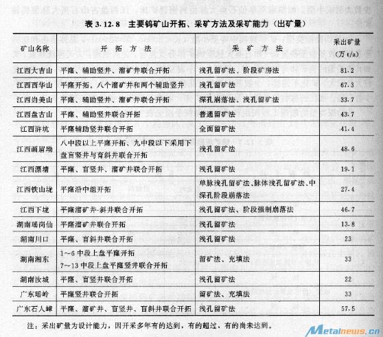 表3.12.8主要鎢礦山開拓、采礦方法及采礦能力(出礦量)