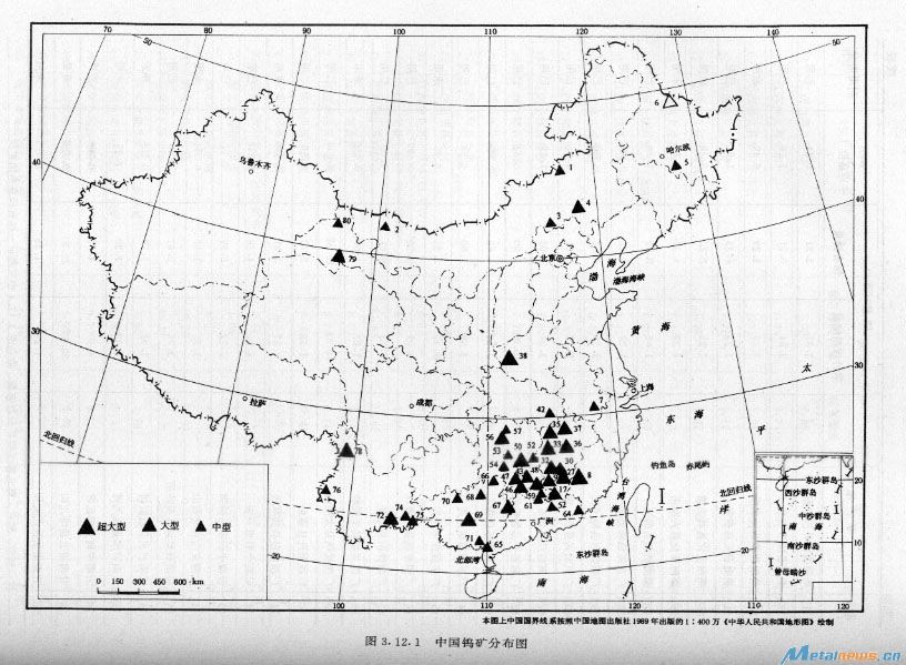 二、儲量分布 在全國已探明鎢礦儲量有21個省、自治區(qū)、直轄市。其中保有儲量在20萬t以上的有8個省區(qū),依次為湖南179.89萬t、江西110.09萬t、河南62.85萬t、廣西34.92萬t、福建30.67萬t、廣東23.02萬t、甘肅22.29萬t、云南21.66萬t,合計485.39萬t,占全國鎢保有儲量的91.7%(以1996年底全國鎢礦保有儲量統(tǒng)計)。 從全國大行政區(qū)分布來看,依次:中南區(qū)占全國鎢儲量的58.2%,居首位,其次是華東區(qū)占28%、西北區(qū)占4.3%、西南占4.1%、東北區(qū)占3.2%、華北區(qū)占2.2%。 在三大經(jīng)濟地區(qū)鎢礦儲量分布的比例:東部沿海地區(qū)占17.1%、中部地區(qū)占75.1%、西部地區(qū)占7.8%。全國大中型、超大型鎢礦分布及其儲量和礦區(qū)開發(fā)利用情況見圖3.12.1和表3.12.4(圖中礦產(chǎn)地名編號與此表礦產(chǎn)地名編號相對應)。