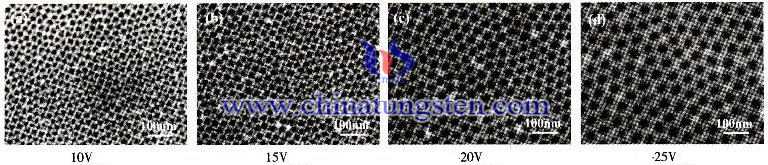 陽極氧化鋁模板法制備納米三氧化鎢。20世紀(jì)90年代以來,隨著自組裝納米結(jié)構(gòu)體系研究的興起,多孔陽極氧化鋁膜(AAO)這種帶有高度有序的納米級陣列孔道的納米材料受到人們的重視。人們將AAO作為模板來制備納米材料和納米陣列復(fù)合結(jié)構(gòu),并在磁記錄、電子學(xué)、光學(xué)器件以及傳感器等方面取得良好的研究成果。采用陽極氧化鋁模板法制備納米三氧化鎢,圖為在不同電壓下制備的多孔納米三氧化鎢薄膜的電子顯微鏡拍攝(SEM)圖片。