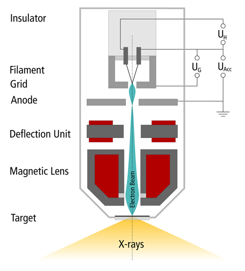 Electromagnetic blasting is created by the slow down of fast electrons on the anode. 1% of the affected energy is transformed into X-ray blasting and 99% into heat. Because of that fact the components within the X-ray tube are submitted by highest thermal resistance. The applied material should possess a highest possible melting point, a big heat capacity, good heat conductivity and a smallest possible vapor pressure.