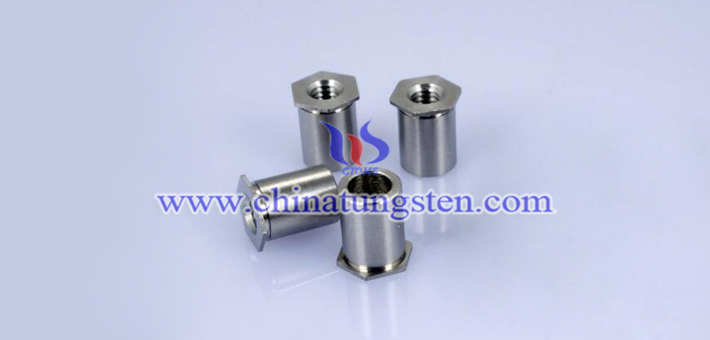 鎢合金螺母柱的一端呈六角形,另一端為圓柱狀,六角邊與圓柱狀中間有一道退刀槽,其內(nèi)形為內(nèi)螺紋。通過壓力機(jī)將六角頭壓入薄板的預(yù)置孔內(nèi),從而使孔的周邊產(chǎn)生塑性變形,變形部分被擠入螺母柱的退刀槽內(nèi),使螺母柱鉚緊於薄板上,從而在薄板上形成一下有效固定的內(nèi)螺紋。
