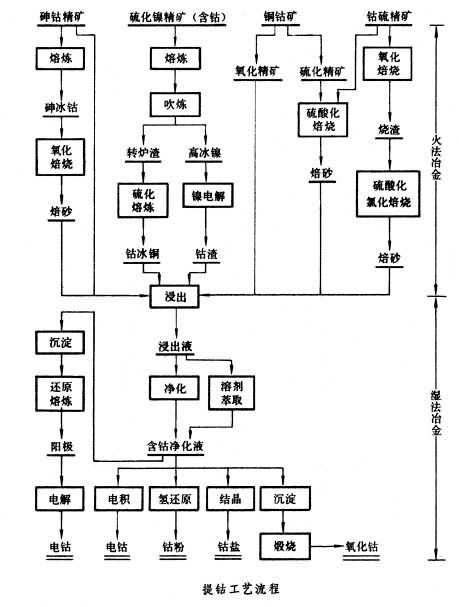 冶煉 鈷礦物的賦存狀態(tài)復(fù)雜,礦石品位低,所以提取方法很多而且工藝復(fù)雜,回收率低。一般先用火法將鈷富集或轉(zhuǎn)化為可溶性狀態(tài),然后再用濕法使鈷進(jìn)一步富集和提純,最后得到鈷化合物或金屬鈷。主要提鈷工藝流程見圖