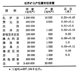 [世界礦山產(chǎn)鈷量和鈷儲(chǔ)量] 中國已探明的鈷儲(chǔ)量最大的是甘肅金川硫化鎳礦中伴生的鈷。云南的硅酸鎳礦以及四川、山東、湖北、山西、廣東等地的黃鐵礦中也含有鈷。
