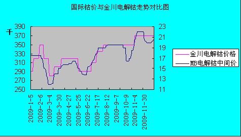 一、2009年中國鈷市行情回顧與分析 1.1國際市場鈷價走勢分析 2009年一季度,由于08年下半年全球金融危機爆發(fā)的延續(xù),電池行業(yè)、硬質(zhì)合金業(yè)需求極度疲軟。國際市場金屬鈷價經(jīng)歷了下跌又反彈的過程:高品位 99.8%鈷價從一月初的16-19美元/磅跌至二月底三月初11-13美元/磅,低品位99.3%鈷價由10.5-15.5美元/磅跌至二月底的9.9 -12美元/磅。由于國內(nèi)外價差擴大,從國際市場進口低價金屬鈷有價格優(yōu)勢,引發(fā)了中國商家的收購熱情,帶領國際鈷價走出低谷。3月底高品位和低品位鈷價 分別回升至14-16美元/磅和11.5-14.5美元/磅。 第二季度,傳言中國國儲局欲購買鈷金屬。國際市場庫存消耗殆盡,非洲供應縮減。投機者趁機進入市場。4月份延續(xù)3月的上升勢頭,并在五月初達到又一個 頂峰,高品位16-17美元/磅,低品位15-16美元/磅;然而由于國際市場鈷的真正消費需求并沒有全面恢復,在投機商的參與下,貿(mào)易商和生產(chǎn)商為了降低風險急于大舉拋貨,鈷價進入下滑通道,6月11日高品位跌至13.5-14美元/磅,低品位鈷至12.15-13.5美元/磅。然后開始新一輪拉升回 調(diào)。 由于西方夏休因素,七八月份通常是鈷市需求的淡季。但是供應面的緊張讓鈷價一直保持堅挺。包括Chambishi在內(nèi)的很多公司的停產(chǎn)、金川產(chǎn)品的缺貨、 日本住友產(chǎn)品的售罄和Vale Inco工人的罷工都是影響供應面的重要因素。另外,亞洲市場化工品行業(yè)和中國電池行業(yè)需求的復蘇也造成對碎陰極鈷的需求增多。日韓鈷消費補充庫存,以及 日本計劃收儲130噸鈷的消息,拉動了國際市場需求上漲。08年末由于價格下跌趨勢中,多數(shù)下游企業(yè)未下采購訂單。韓國電池和化工企業(yè)對后期鈷市看好,因 此對鈷的采購量不斷增加,7月份的采購水平已經(jīng)超過08年的峰值;而日本電池企業(yè)復工率達到90%左右,加上上半年自身庫存不斷消耗,迫切有補貨的要求。 帶動國際鈷市活躍起來。此波拉升至8月13日,高品位鈷價達到18.8-20.2美元/磅低品位鈷價升至17.5-18.5美元/磅。此后國際鈷價進入較 長時間的橫盤狀態(tài)。截止第三季度末稍有調(diào)整,分別為18.5-19.5美元/磅和 15.55-16.8美元/磅。 7月份日韓補貨的行為并不能從根本上改變整個國際市場需求低迷的局面。進入第四季度,隨著該利好的炒作影響漸漸消退,市場沒有迎來新的利好支撐。十一期間,鈷價迅速下挫,高品位鈷價至16-17美元/磅,低品位鈷價14.5-15.6美元/磅。隨后在2010年2月份鈷期貨合約時間表的確定、對中國四 季度鈷國內(nèi)需求轉(zhuǎn)暖的預期、中國買家國際市場的采購以及俄羅斯超級合金行業(yè)需求以及等因素推動下,鈷價快速攀升,11月9日達到年內(nèi)高點,高品位鈷價 21.5-22.5美元/磅,低品位鈷價至19.5-20.5美元/磅。鈷價全面升至20美元以上。新高之后,在實際需求并無實質(zhì)改善的前提下,受炒作資 金獲利平倉以及基本面不強的影響,鈷價又有所回落。十二月中旬開始國際鈷價略有上揚。 1.2金川電解鈷價格走勢分析