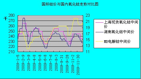 國內(nèi)氧化鈷市場2月份出現(xiàn)26萬甚至超過27萬/噸的年內(nèi)高價,這還是年初下游工廠多數(shù)進行試探性生產(chǎn),電池行業(yè)有力帶動鈷業(yè)的采購下出現(xiàn)的。 隨后全年基本在22萬-26萬/噸的區(qū)間內(nèi)波動,市場價格波動趨勢跟國際鈷價基本保持一致?梢钥闯稣麄2009年國內(nèi)氧化鈷消費需求的慘淡情況。