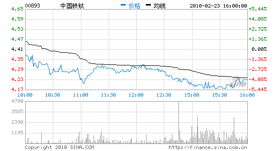 受業(yè)績遜于預期影響,中國鐵鈦昨日股價下滑4.08%至4.23港元。