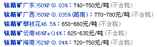 今日國內(nèi)各地區(qū)鈦精礦價(jià)格具體情況如下: