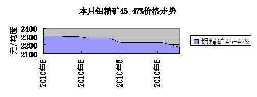 延續(xù)上個(gè)月鉬弱勢調(diào)整態(tài)勢,本月中國鉬價(jià)繼續(xù)承壓。鋼鐵行業(yè)需求不旺,供應(yīng)過剩、宏觀利空政策不斷出臺,以及不斷升級的歐債危機(jī)問題和歐元的持續(xù)疲軟狀態(tài) 對市場造成的心理壓力,中國鉬價(jià)不斷下探,但市場預(yù)計(jì)受成本壓力,下跌空間不會(huì)很大。鉬精礦45%從本月初的2,230-2,320元/噸度下調(diào)至月末的 2,150-2,200元/噸度。氧化鉬57%(工業(yè))月初的2,430-2,450元/噸度至2,200-2,250元/噸度鉬鐵 60% 由月初的152,000-154,000元/噸至目前的142,000-143,000元/噸