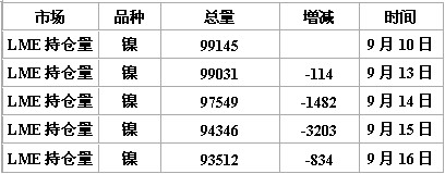最大金屬消費(fèi)國(guó)中國(guó)8月經(jīng)濟(jì)運(yùn)行穩(wěn)健,提振市場(chǎng)對(duì)未來大宗商品消費(fèi)增加預(yù)期,支撐金屬走勢(shì);歐洲銀行業(yè)擔(dān)憂情緒緩解,風(fēng)險(xiǎn)偏好上升,推動(dòng)基本金屬上漲。受此 影響,本周倫鎳漲約800美元,成交較上周減少,維持平穩(wěn)狀態(tài)。至周四收盤,持倉大減約5519至93512,庫存增加252噸至119412噸。另外, 10月期鎳與11月期鎳存在逆價(jià)差,市場(chǎng)傳聞或?qū)⒂幸枣嚍闃?biāo)的的商品投機(jī)基金成立,也推升了鎳價(jià)。