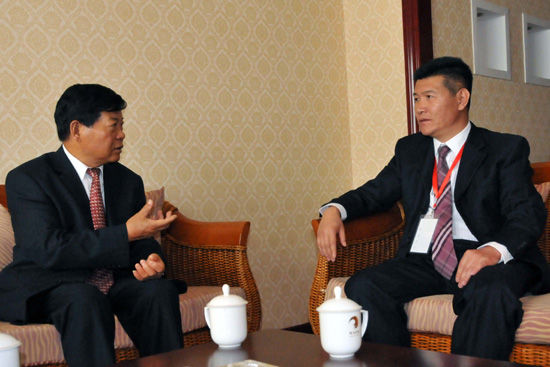 中國(guó)有色金屬工業(yè)協(xié)會(huì)會(huì)長(zhǎng)康義(左一)同中國(guó)有色金屬工業(yè)協(xié)會(huì)鎂業(yè)分會(huì)副會(huì)長(zhǎng)、寧夏華盈集團(tuán)董事長(zhǎng)朱建華(右一)進(jìn)行交流