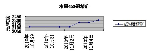 國內(nèi)鉬市 本周國內(nèi)鉬價(jià)繼續(xù)上行,鉬鐵主流價(jià)格漲至148,000-150,000元/噸,也有高達(dá)152,000元/噸的報(bào)價(jià),而成交多在148,000元/噸浮 動(dòng),45%鉬精礦也漲到了2180-2200元/噸度。國土資源部正準(zhǔn)備將鉬列入保護(hù)性開采礦種的消息支撐了鉬精礦商報(bào)漲情緒。各大型鉬企股票更是大幅上 漲。而當(dāng)前鉬鐵現(xiàn)貨供應(yīng)較為緊缺,鉬精礦廠商更是堅(jiān)持高報(bào)價(jià)。但較上周而言,本周終端需求開始放緩,后期鉬鐵價(jià)格相對(duì)穩(wěn)定。 后期預(yù)測(cè) 在連續(xù)兩個(gè)多月持續(xù)不振后,近期鉬市大幅上漲,加上鉬礦最為稀有金屬,實(shí)行開采限量消息的支撐,鉬市連續(xù)上行,但是本周需求開始放緩,加上歐洲鉬市走勢(shì)放緩,下周國內(nèi)鉬市料承受一定下行壓力。 國際外及進(jìn)出口市場(chǎng) 歐洲鉬市:在低迷了近一個(gè)多月后,于10月后期反彈上漲,9、10月份的傳統(tǒng)旺季至10月末才有所顯現(xiàn),消費(fèi)商需求有所增加,但是更多的還是來自貿(mào)易商的 需求。本周歐洲鉬鐵價(jià)格漲到了39.75-40美元/千克,氧化鉬也漲到了15.8-16美元/磅。但市場(chǎng)需求總體不夠強(qiáng)勁,后期鉬鐵氧化鉬走穩(wěn),氧化鉬 購買商更是表示高于16美元/磅不考慮買貨。下周歐洲鉬市承受一定壓力。 美國鉬市:在國際鉬市看漲氣 氛的影響下,美國鉬市本周也有一定的支撐,盡管美國鋼鐵業(yè)持續(xù)不振,本周產(chǎn)能利用率再度下降,但是天然氣和石油勘探業(yè)的發(fā)展有望帶動(dòng)含鉬特鋼的需求。本周 美國鉬鐵價(jià)格漲到了17.4-17.9美元/磅,氧化鉬也漲至15.5美元/磅以上,后期料持穩(wěn)。 進(jìn)出口市場(chǎng):本周進(jìn)出口市場(chǎng)正常運(yùn)行,出口量有所加大。