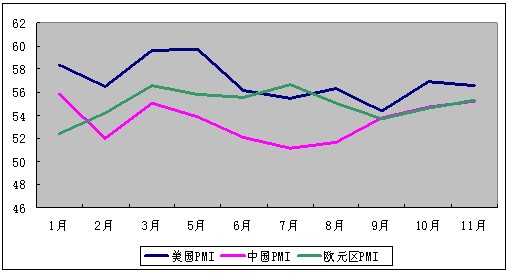 圖1 美國,中國以及歐元區(qū)11月份PMI數(shù)據(jù)