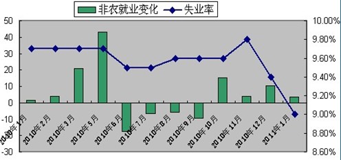 失業(yè)率由去年12月份的9.4%降至9.0%,低于市場(chǎng)預(yù)期的9.5%,大約有1386萬(wàn)有就業(yè)意愿的美國(guó)公民未能找到工作。失業(yè)率為連續(xù)第二個(gè)月降低,但仍位于9%的高位。